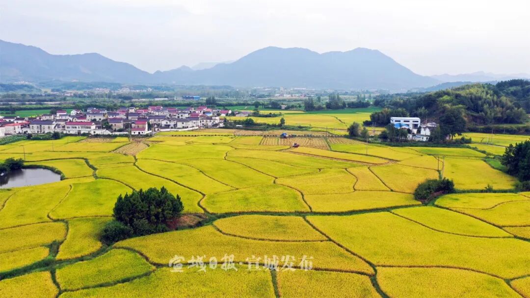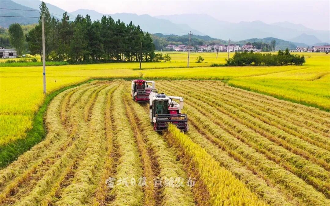 8月23日,旌德县三溪镇建强村金黄色稻田传来阵阵机械轰鸣声,多台收割机正在稻田穿梭,忙碌收获着来之不易的丰收稻谷。