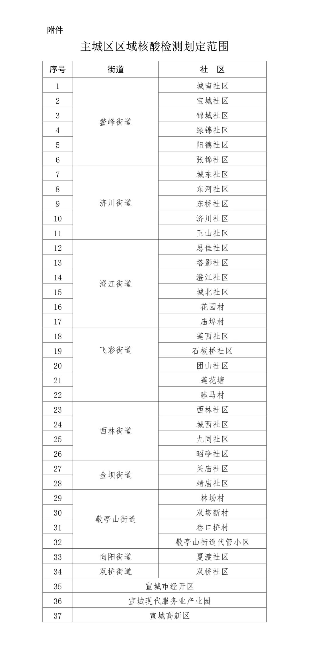 主城区三环范围内的9个街道34个社区(村)和宣城经开区、宣城现代服务业产业园、宣城高新区(详见附件)。