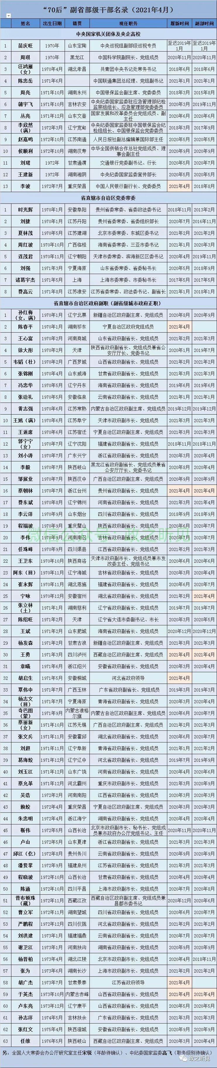 目前,全国“70后”省副部级领导至少已有84人,第一人是时光辉。