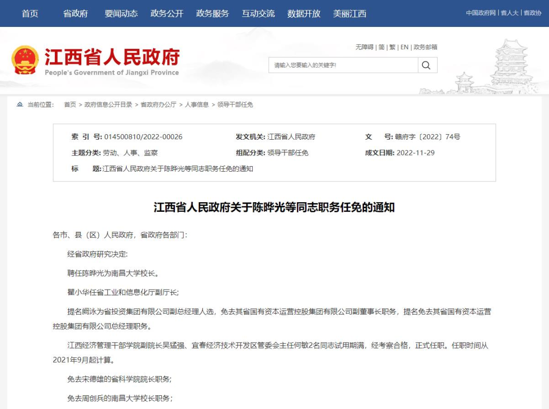 江西省人民政府关于陈晔光等同志职务任免的通知