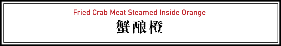▶ 古法蟹酿橙:将剔出的全蟹粉不经炒香而直接填入橙子,并用加了酒醋的水蒸,再以醋盐供食,果意浓郁。而今也有在全蟹粉炒香后加入橙子果粒,再填入橙子一起蒸的,果感明显。