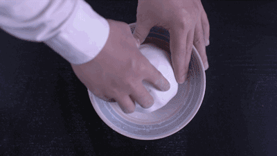 揪下一小块糯米团,在手掌中揉搓,再压扁成圆团,直到糯米成小桶状