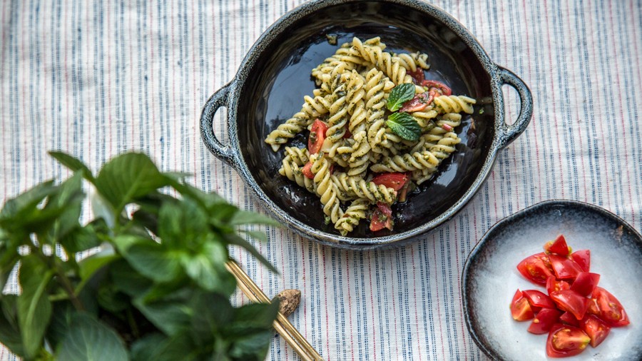 ▶ 雨前椿芽嫩无丝,雨后椿芽生木质。一年中,只有谷雨前几天,才能吃到最新鲜的香椿嫩芽儿。而为了保存瞬间的美味,做成香椿酱是最好的方法,用不完的香椿酱可以冷藏放进密封罐子。还可以用来拌面、炒饭、拌豆腐和摊鸡蛋饼等。❶ 将新鲜香椿芽洗净,晒干,然后切碎。❷ 将腰果、杏仁、松子、亚麻籽和黄豆捣碎,和切碎的香椿一起,拌成酱。❸ 加盐调味,再加入植物油、玉米油或者葵花籽油都可以,调匀后香椿酱就完成了。❹ 将意面煮熟,盛出。另取一口锅,加热,倒油,依次加入番茄、意面和香椿酱。❺ 拌匀,装盘,撒上薄荷叶即可。 | |