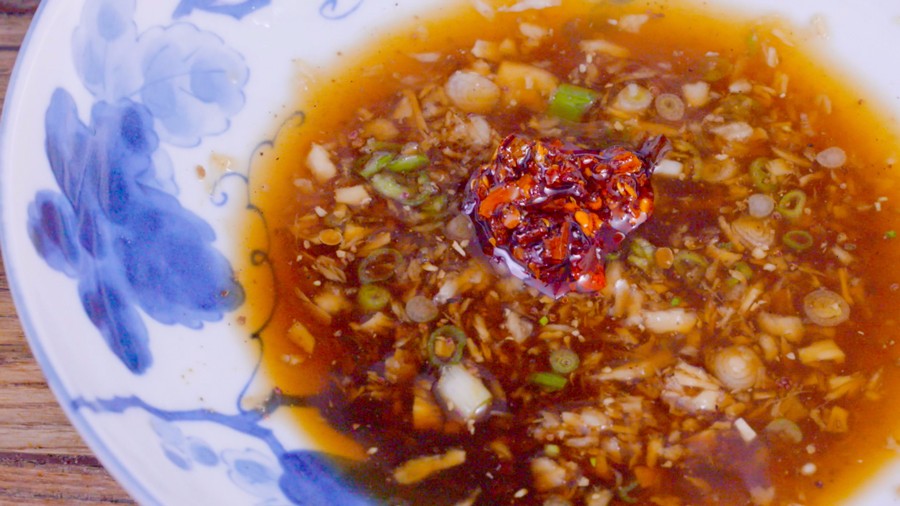 准备一只面碗,倒入适量酱油、陈醋、蒜水、姜水、花椒粉、白汤、葱花、红油辣椒,轻轻搅拌。