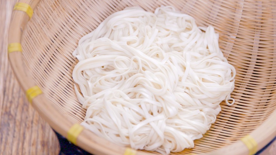 ❷ 把面条放在竹篾上摊开,加熟菜籽油,抓匀。