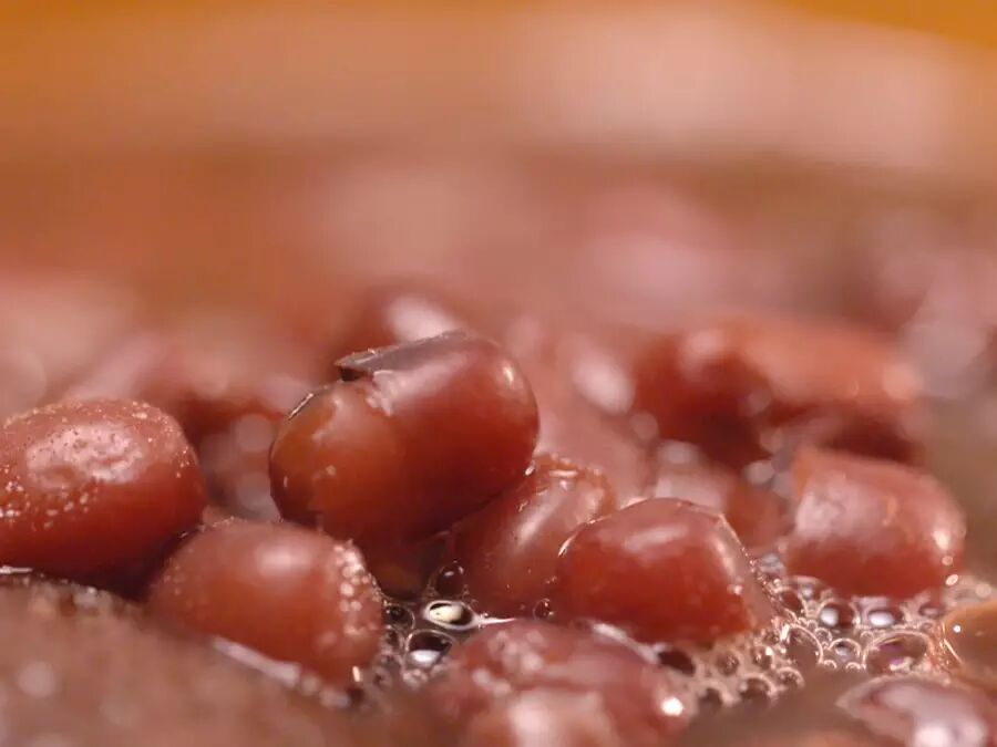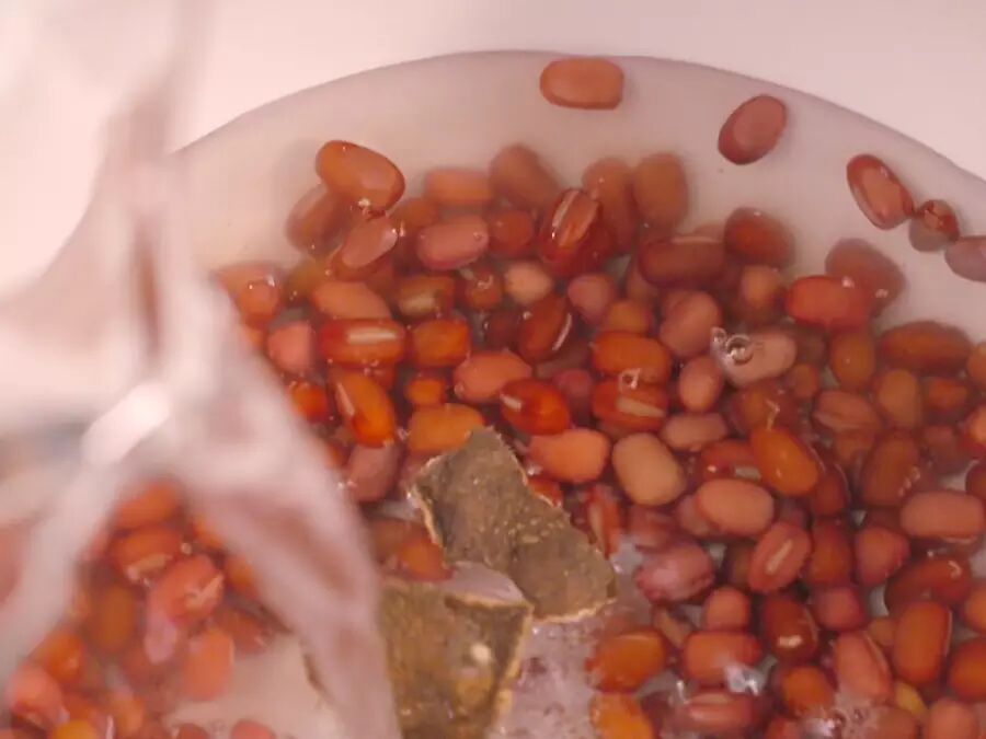 红豆要提前一夜泡发好,倒入锅中,加一片陈皮,加适量的水煮开。
