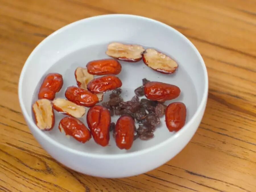 将葡萄干和红枣泡在水中备用。