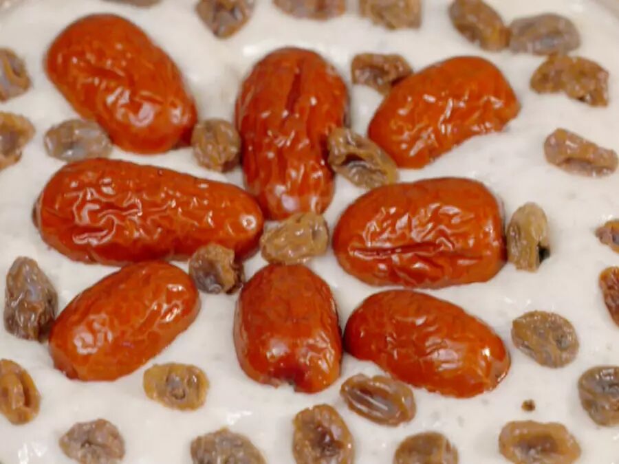 在表面铺上泡开的葡萄干和红枣。