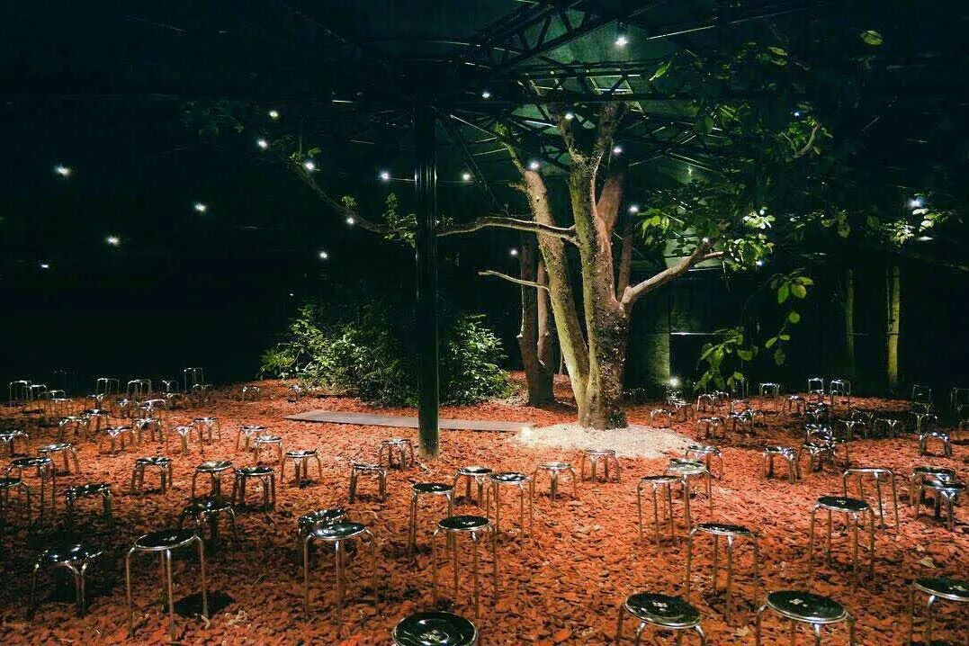 在棚上面做好开口,让原本在这里的树木自由地生长出去。剧场的凳子就是台湾街边面馆最常见的坐凳。