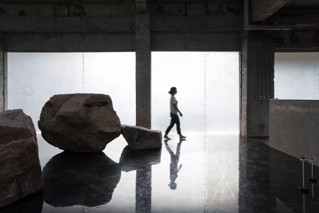主屋内部,想要呈现在自然中上课或聊天的状态,所以就地取材,找了现场散落的大石头,聚集起来,取代我们常用的家具和桌椅。