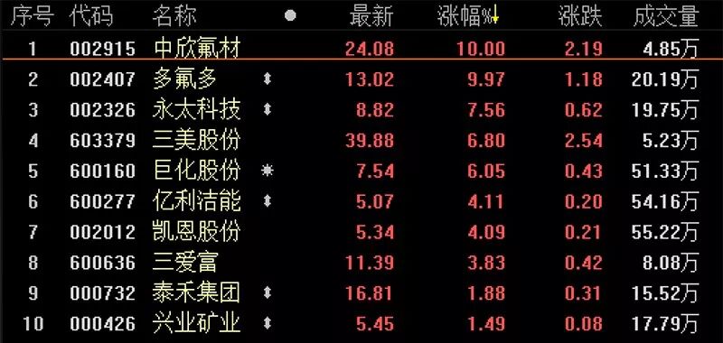 盘面显示,午后氟化工板块开始拉升,至收盘,中欣氟材、多氟多涨停,永太科技涨幅超过7%。