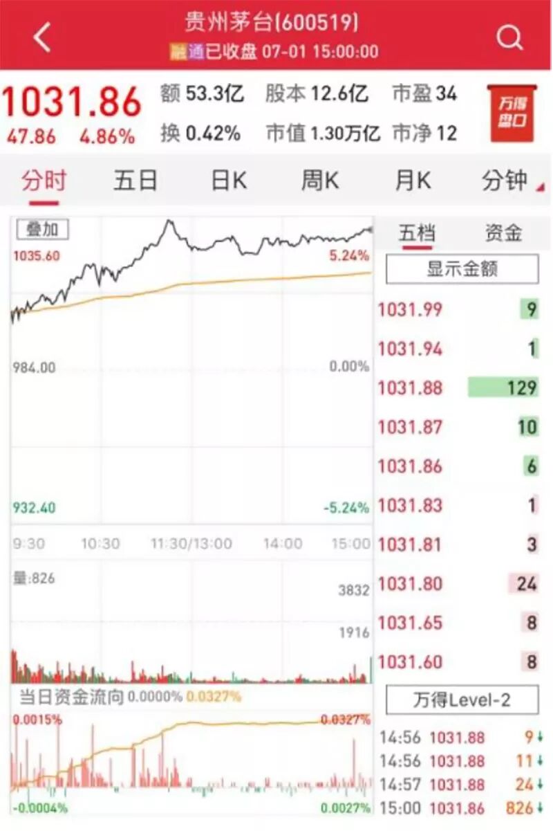 截至今日收盘,贵州茅台股价报1031.86元/股,涨幅4.86%。公司市值升至1.2962万亿元,一举超过中国石油与农业银行,排名A股第四位。
