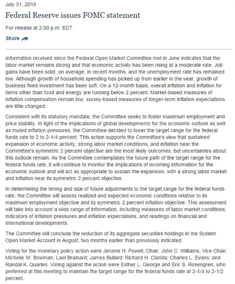 一如外界预期,美联储在北京时间今日凌晨宣布将联邦基金利率目标区间下调25个基点到2%至2.25%的水平。