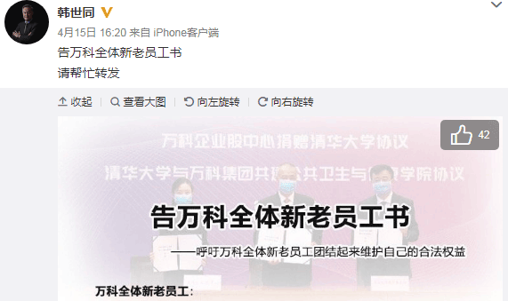 4月20日,广东省房地产研究会执行会长韩世同以万科前员工身份,实名致信证监会,对王石及万科企业股资产管理中心(下称“万科企业股中心”)向清华捐赠2亿股股权的归属问题、处置权问题等提出了四点质疑,引发舆论关注。