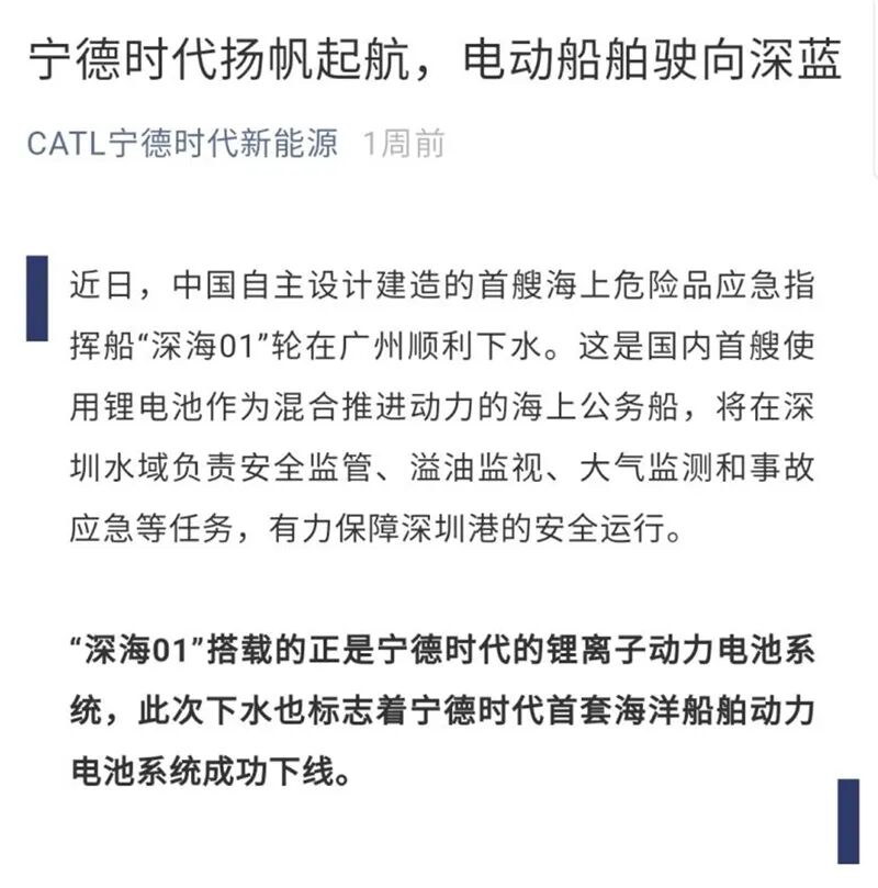 4月28日,我国自主设计建造的“深海01”轮在广州顺利下水。作为国内首艘油电混合动力的海上公务船,“深海01”轮采用了宁德时代生产的磷酸铁锂电池组。与此同时,国轩高科和亿纬锂能也收到纯电动船的配套订单。