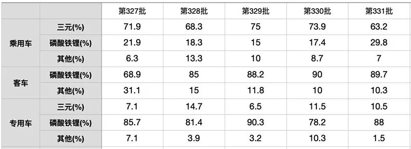 对照今年工业和信息化部公示的多批《道路机动车辆生产企业及产品公告》,磷酸铁锂电池在乘用车领域配套车型的占比保持增长趋势,尤其在第331批公告中,占比已接近三成。在客车、专用车等商用车领域,磷酸铁锂电池的装机占比维持着约80%的高位。
