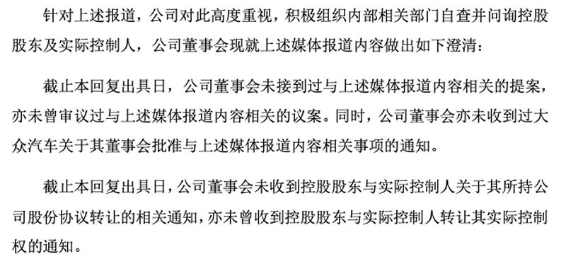 4月21日,有媒体称,大众汽车拟通过定向增发不超过30%股份及协议转让股权的方式,成为国轩高科第一大股东,并寻求在未来三年内成为其控股股东。面对深交所的关注函,国轩高科迅速澄清,表明大众汽车控股一事子虚乌有,双方的合作关系没有形成任何实质性的有约束力的协议、承诺或其他安排。