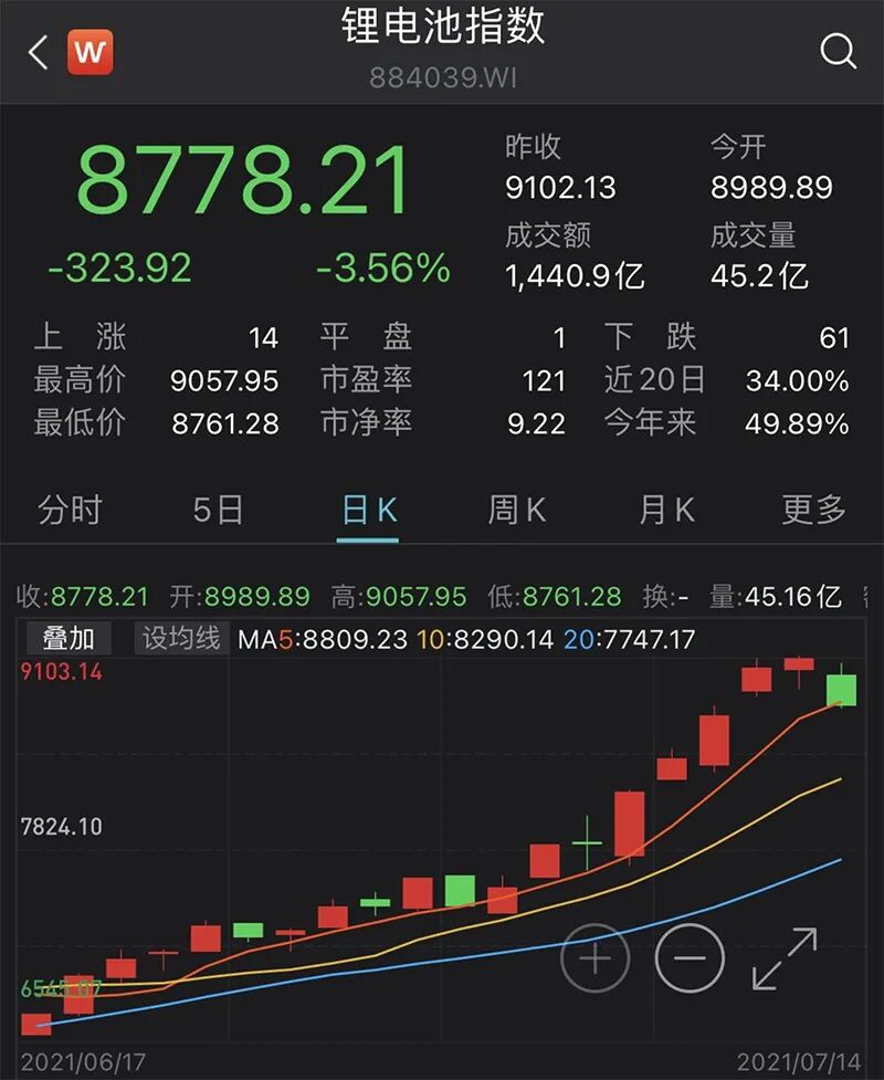 7月14日,A股锂电池板块经历较大调整。Wind锂电池指数下跌3.56%,76只成分股中,14只上涨、1只平盘、61只下跌。今年火热的新能源锂电板块行情,会就此掉头吗?