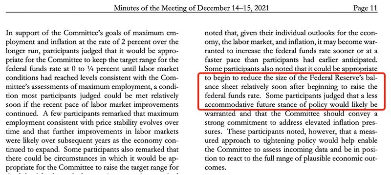 根据会议纪要,与会官员在去年12月的议息会议上认为,鉴于通胀压力上升和劳动力市场走强,美联储没有必要再维持更加宽松的货币政策,有必要提前或以高于此前预期的速度提高联邦基金利率。