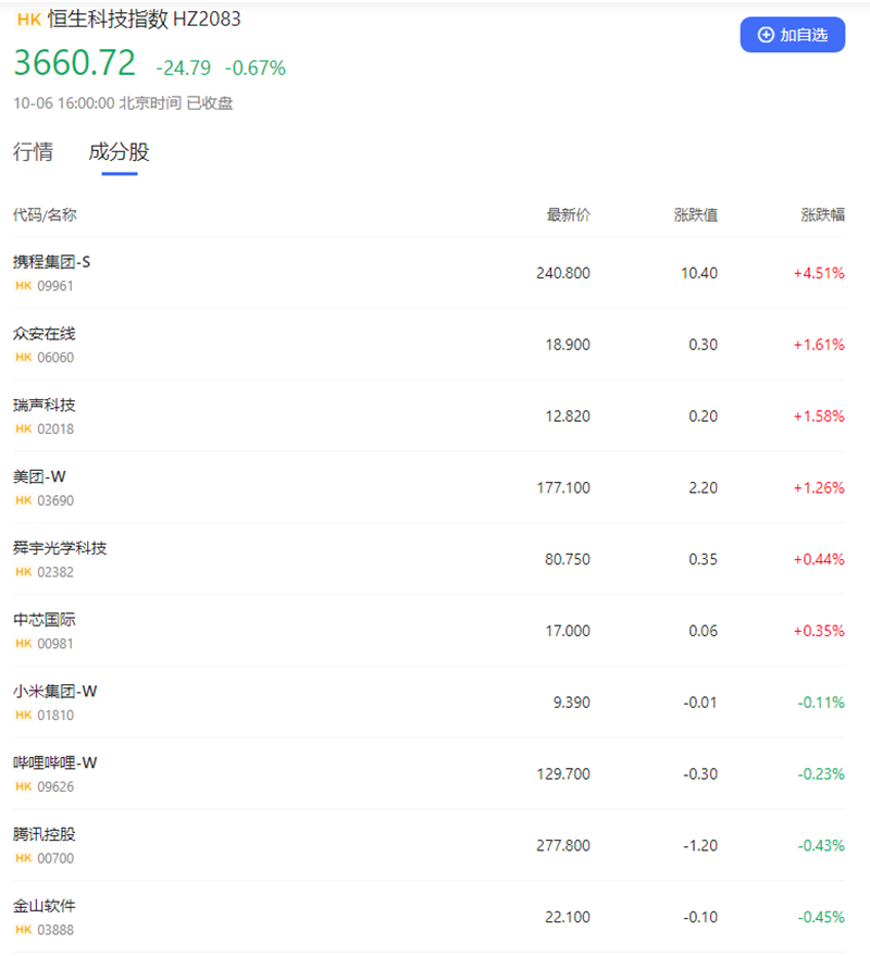 在经历了连续两日大涨之后,欧美股市于当地时间10月5日集体下跌。今日,港股也迎来调整,主要指数在小幅高开后走低。截至6日收盘,恒生指数跌0.42%,恒生国企指数跌0.63%,恒生科技指数跌0.67%。