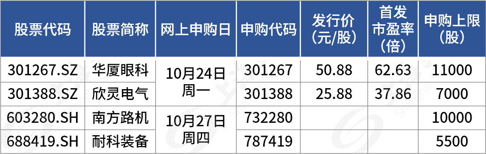 据目前安排,若无变化,本周(10月24日至28日)有4只新股可申购,包括科创板1只、创业板2只、沪市主板1只。