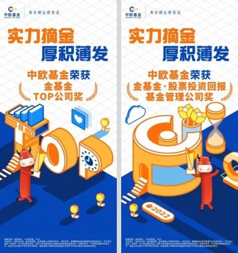 有的基金公司的海报选择漫画形式。例如,在中欧基金的海报上,“牛欧欧”捧着奖杯小步快跑。
