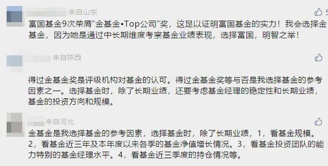 从留言区来看,网友们讨论颇为热烈。有网友表示,得过“金基金”奖是评级机构对基金的认可。得过“金基金”奖等与否是选择基金的参考因素之一。选择基金时,除了长期业绩,还要考虑基金经理的稳定性和长期业绩,基金的投资方向和规模。