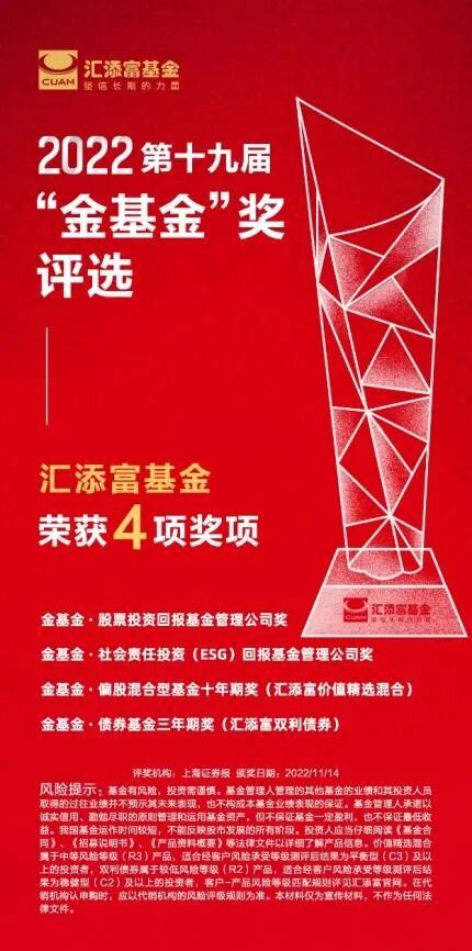 和富国基金选择金色为主色调有所不同,同样喜提四项大奖的汇添富基金则以红色元素为主。