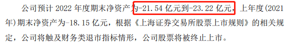 相较于亏损的净利润,更让人忧心的是公司的净资产情况,因为这直接关系到公司是否“退市”。公告显示,*ST凯乐预计2022年度期末净资产为-21.54亿元到-23.22亿元,上年度(2021年)期末净资产为-18.15亿元,根据《上海证券交易所股票上市规则》(以下简称《股票上市规则》)的相关规定,公司将触及财务类退市指标情形,公司股票将被终止上市。