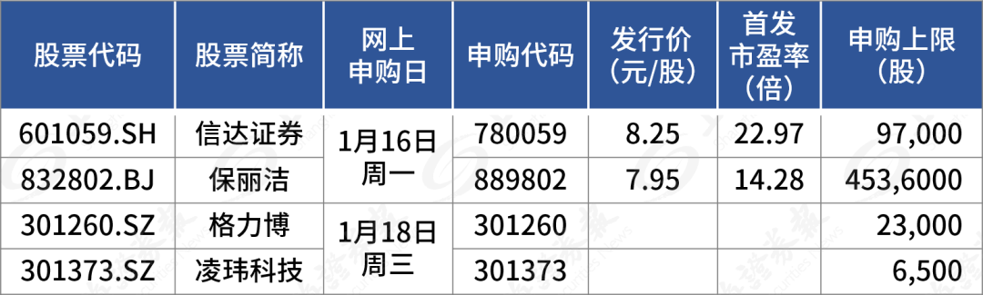 据目前安排,若无变化,下周(1月16日至20日)有4只新股可申购,包括创业板2只、北交所1只、沪市主板1只。
