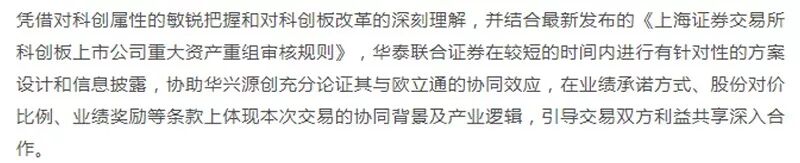 据华泰联合方面称,在《科创板上市公司重大资产重组审核规则》发布后,华泰联合证券就在较短的时间内进行有针对性的方案设计和信息披露,协助华兴源创充分论证其与欧立通的协同效应,在业绩承诺方式、股份对价比例、业绩奖励等条款上体现本次交易的协同背景及产业逻辑,引导交易双方利益共享深入合作。