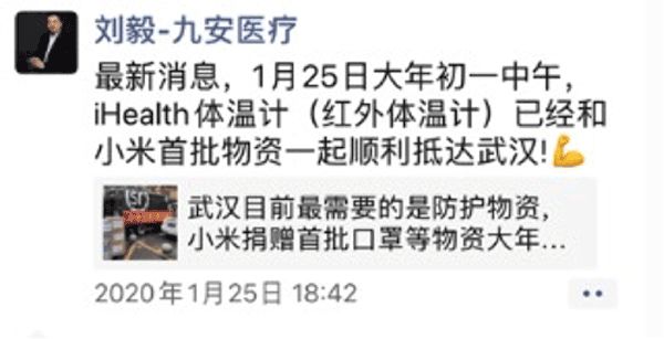 2月3日,刘毅在朋友圈写道:九安医疗捐赠给火神山医院的iHealth红外额温计已经送抵。