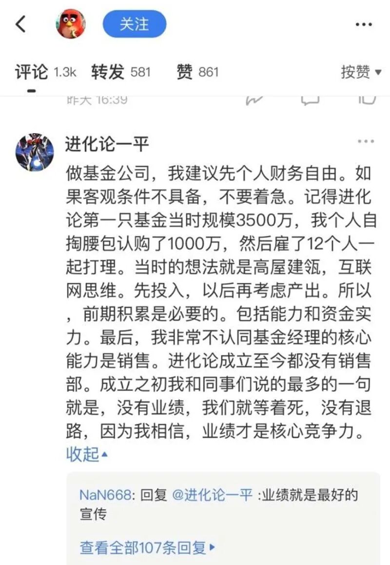 前海进化论资产总经理王一平表示,基金经理的核心能力绝不是销售。“进化论第一只基金募集了3500万元,个人掏腰包1000万,要先投入后产出,前期积累很有必要,我和同事说的最多的一句话是,没有业绩就等着死,因为业绩才是核心竞争力。”