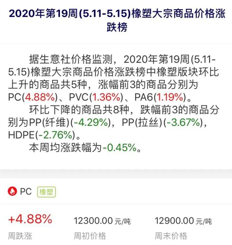 据生意社价格监测,5月11日至5月15日,PC涨幅为4.88%。