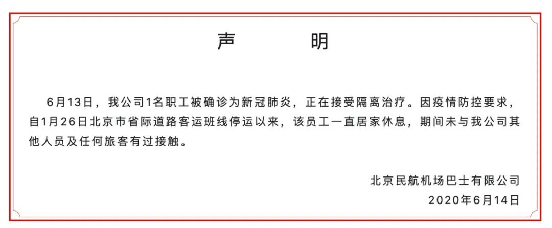14日下午,北京机场巴士公司官方微信发布声明,该病例正在接受隔离治疗。自1月26日北京市省际道路客运班线停运以来,该员工一直居家休息,期间未与公司其他人员及任何旅客有过接触。