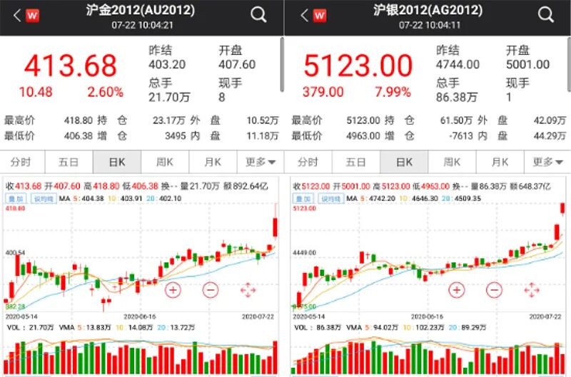 国内期市方面,截至发稿,沪金主力合约最高窜至418.8元/克,沪银主力合约涨停。