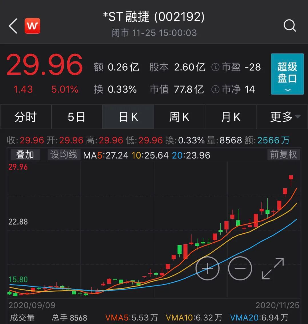 或许与此消息有关,*ST融捷最近一个多月股价飙涨,尤其是在定增消息披露前,股价已经连续3天涨停。11月25日,定增公告披露后,股价直接一字涨停。