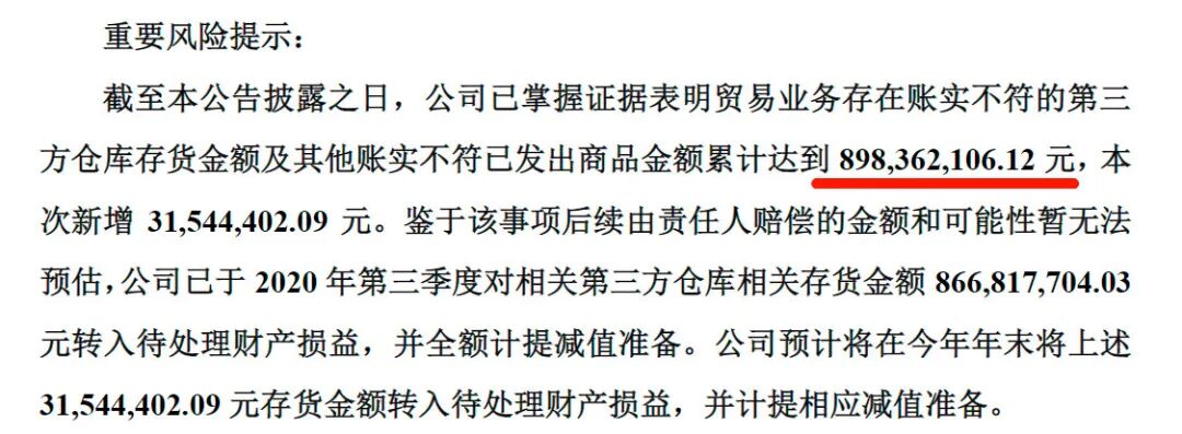 据广州浪奇于去年年底发布的进展公告,公司已掌握证据表明贸易业务存在账实不符的第三方仓库存货金额及其他账实不符已发出商品金额累计达到8.98亿元。同时,公司及子公司奇化化工交易中心在四川库区结存的部分存货,因受现场条件限制仍未能准确核实数量及确定货物权属,涉及货值合计3.4亿元。