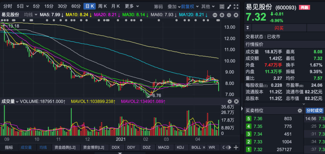 4月28日上午,易见股份股价大幅下杀,至午间收盘前,其股价已经逼近跌停,午后则封死跌停。