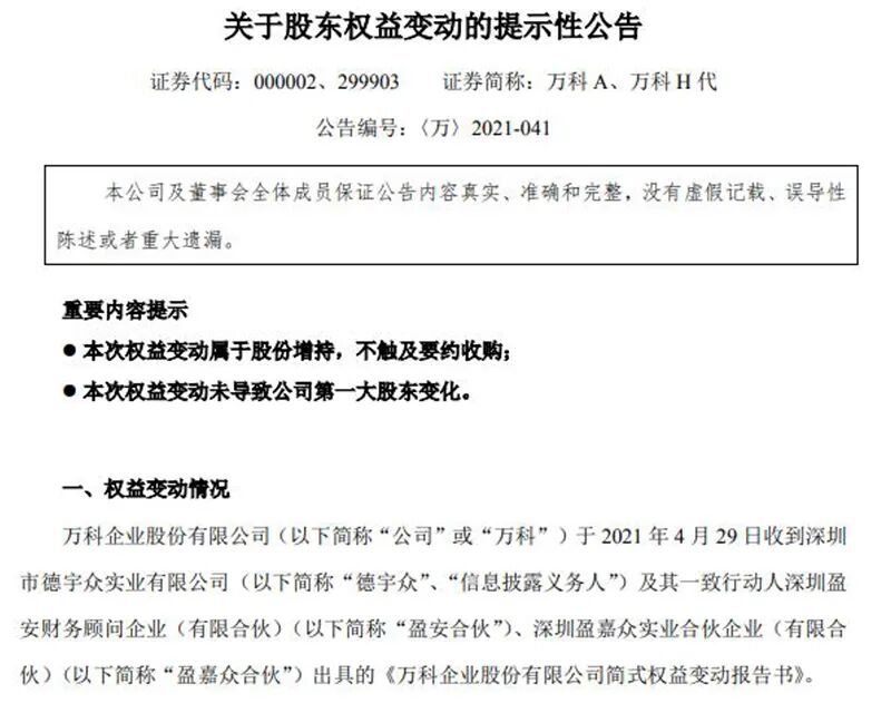 4月29日晚间,万科公告称,公司收到深圳市德宇众实业有限公司及其一致行动人深圳盈安财务顾问企业(有限合伙)、深圳盈嘉众实业合伙企业(有限合伙)出具的《万科企业股份有限公司简式权益变动报告书》,当日,德宇众以自有资金在二级市场买入万科A股80.48万股,占万科已发行股份的0.01%,至此,德宇众及其一致行动人合计拥有表决权的万科股份达到5.81亿股,占万科总股本的5.00%,触及5%举牌线。