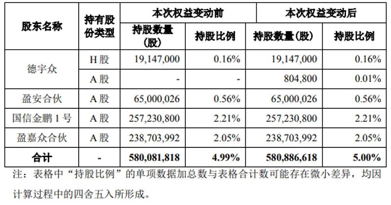 公告显示,信息披露义务人德宇众系盈安公司持有100%股权的全资子公司,盈安合伙和盈嘉众合伙系盈安公司作为普通合伙人及执行事务合伙人实际控制和管理的合伙企业,同时盈安合伙是国信证券所管理的国信金鹏1号的委托人,持有国信金鹏1号的全部份额C,并拥有国信金鹏1号所持股票的表决权。