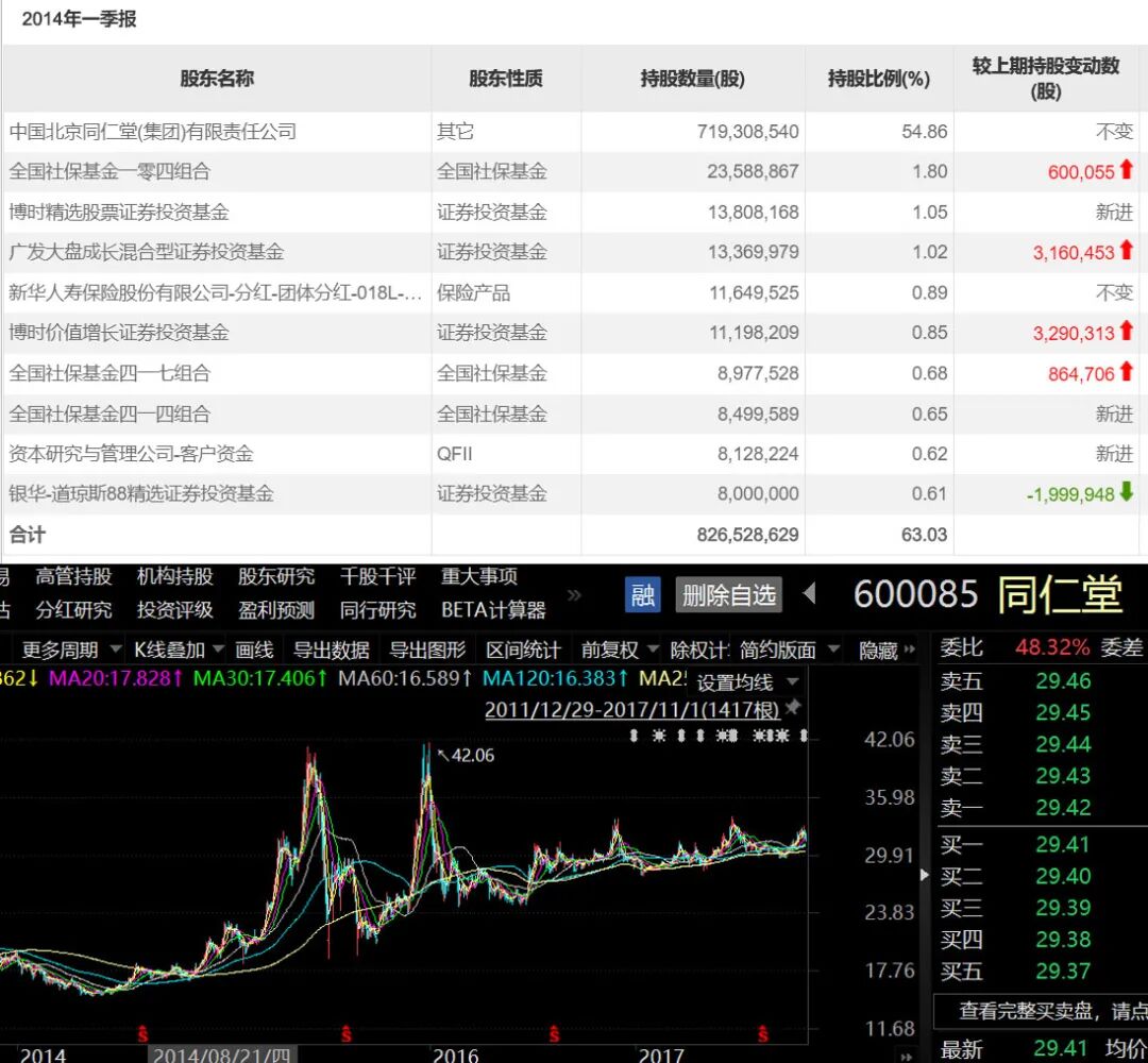 早些年资本研究在同仁堂上的操作也类似。2014年一季度同仁堂跌幅接近19%,“资本研究与管理公司-客户资金”便是在这一阶段新进公司的十大股东名单,持股数量为812.8万股,直至2014年三季度末,资本研究的持股数量一直不变。从股价表现来看,同仁堂二季度初-四季度末涨幅超过30%。