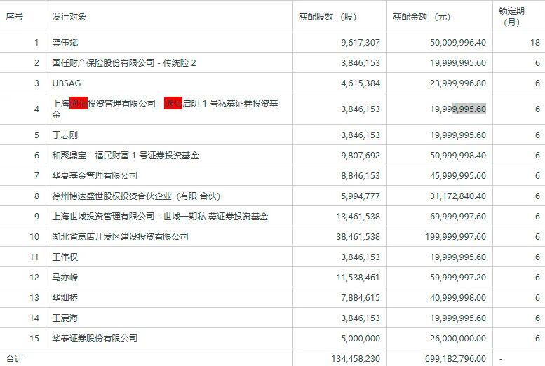 5月7日晚间,瑞丰光电发布向特定对象发行股票发行情况报告书,公告显示,此次发行价格为5.2元/股,发行股数134,458,230股,募集资金总额699,182,796.00元。其中百亿级私募通怡投资旗下的通怡启明 1 号私募证券投资基金获配384.6万股。