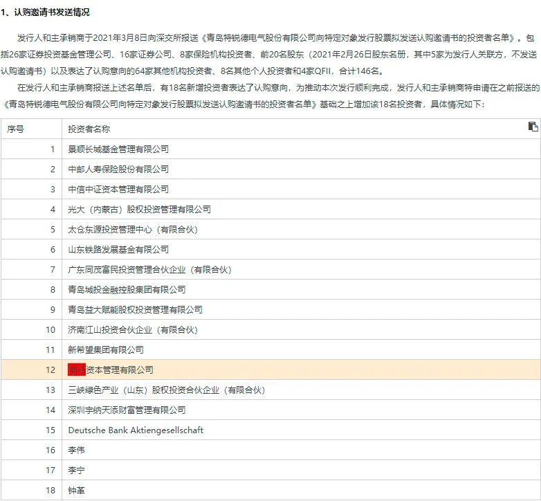 公告显示,发行人和主承销商于2021年3月8日向深交所报送《青岛特锐德电气股份有限公司向特定对象发行股票拟发送认购邀请书的投资者名单》。不过后又有18名新增投资者表达了认购意向,这18名投资者中就包括了高瓴资本管理有限公司。