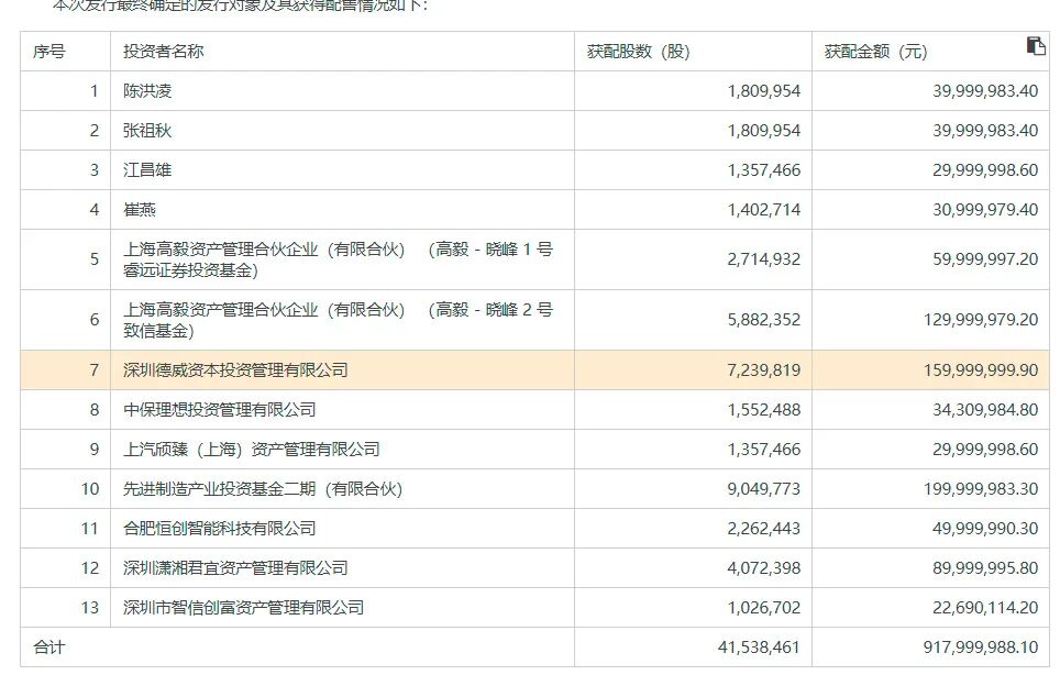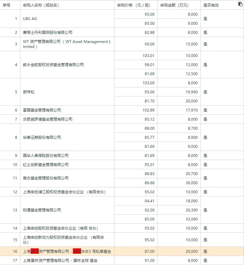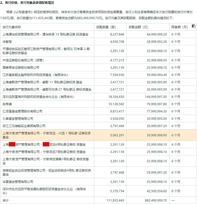 高毅资产首席投资官邓晓峰管理的高毅-晓峰1号睿远证券投资基金、高毅-晓峰2号致信基金,分别获配了271.49万股、588.24万股,合计获配金额达到1.9亿元左右。另一家百亿级私募上汽颀臻(上海)资产管理有限公司则获配了135.75万股,获配金额约为3000万元。