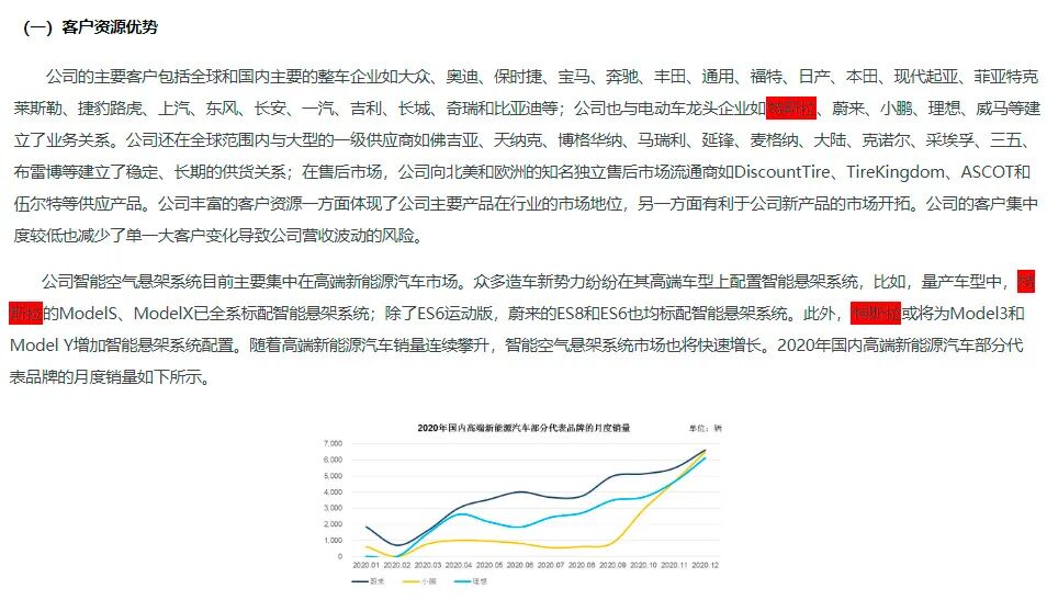 保隆科技年报显示,公司智能空气悬架系统目前主要集中在高端新能源汽车市场。比如,量产车型中,特斯拉的ModelS、ModelX已全系标配智能悬架系统;除了ES6运动版,蔚来的ES8和ES6也均标配智能悬架系统。随着高端新能源汽车销量连续攀升,智能空气悬架系统市场也将快速增长。