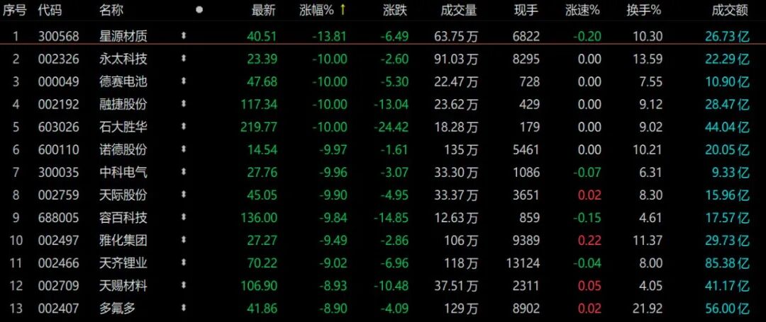 受电解液溶剂龙头石大胜华闪崩影响,多只锂电股临近尾盘跳水,永太科技、德赛电池、融捷股份、诺德股份纷纷跌停,天际股份、容百科技、雅化集团、天齐锂业、容百科技等下跌超9%,创业板公司星源材质下跌13.81%。