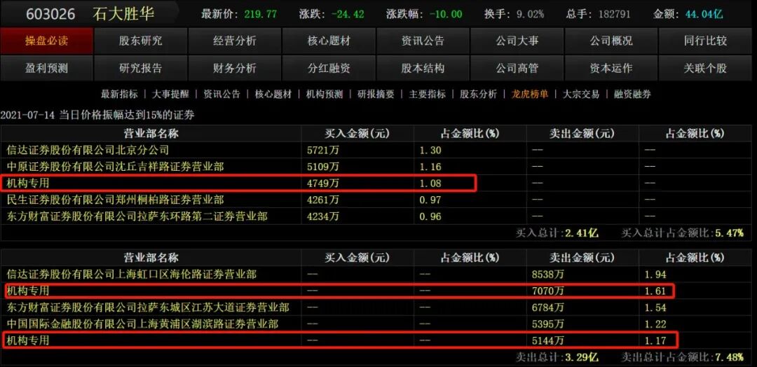 从石大胜华盘后龙虎榜数据来看,有一家机构席位买入4749万元,有两家机构席位合计卖出1.22亿元。