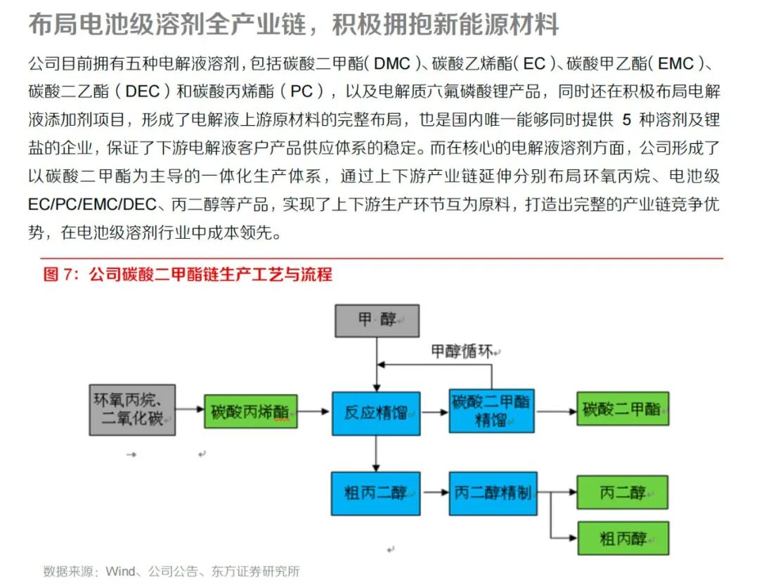 公司股价大涨得益于其新能源产业布局。近年来,新能源车高歌猛进的势头不减,锂电产业上下游景气度持续向好,拥有五种电解液溶剂以及电解质六氟磷酸产品的石大胜华已形成电解液上游原材料的完整布局。