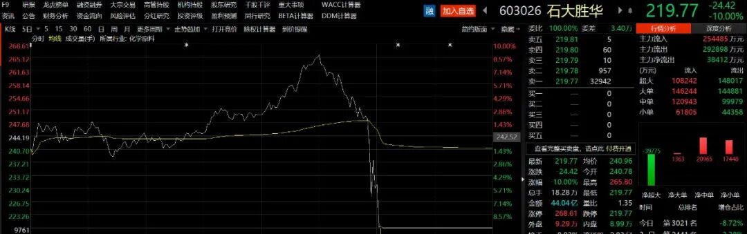 13日还放量涨停的石大胜华,14日盘中拉升后高台跳水,几乎上演“天地板”走势。截至收盘,石大胜华跌停报219.77元,当日成交额达到44.04亿元,振幅达到18.85%。